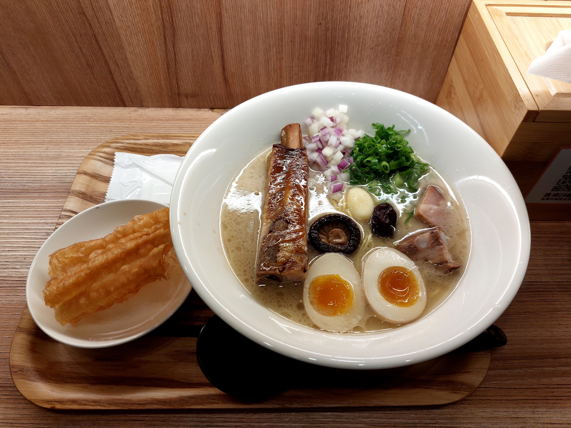 初訪的我點了白湯大蒜 1.0 五花硬麵重鹹,溏心蛋不錯,湯頭大蒜味濃郁很爽,第一次看到五花肉這樣小小薄片處理,好吃!